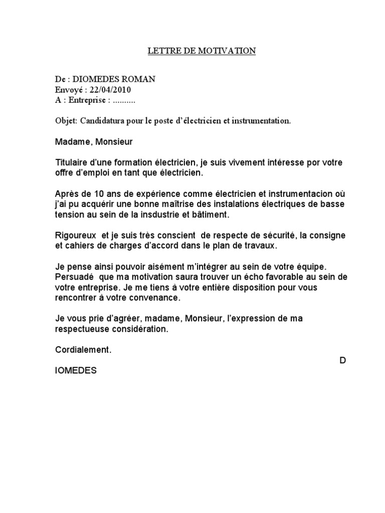 Lettre Motivation Candidature Spontanee Electricien A Telecharger